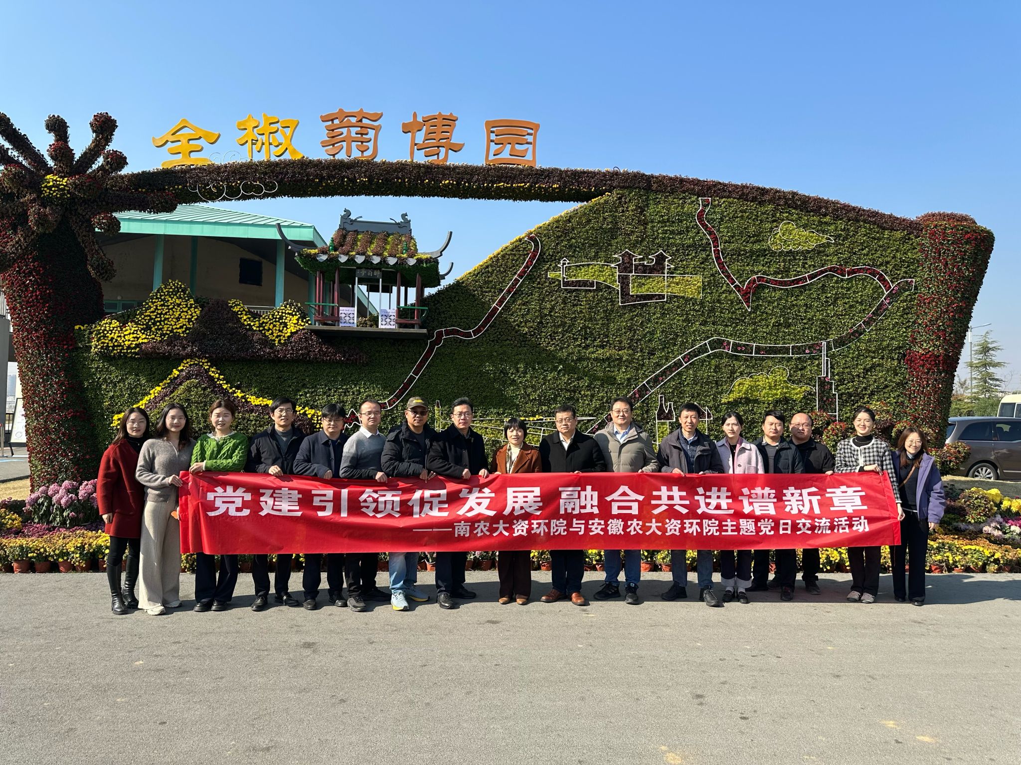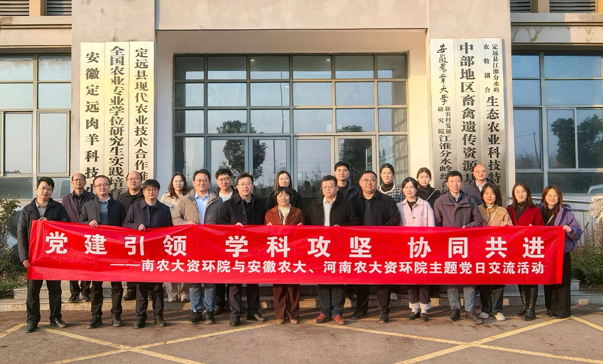 为积极推进党建工作创新,以高质量党建引领学科发展,加强校际党建科教协同发展经验交流与合作,11月21日,我院张瑞福院长、理学院汪鹏院长、我院党委副书记孙笑逸、副院长张旭辉和袁军等一行18人,我校实验室与基地处孙仁帅副处长等4人,与安徽农业大学资环学院党委书记王琼、张震院长等11人、河南农业大学资环学院王宜伦院长等3人,共赴南京农业大学安徽全椒菊博园、滁州科教创新园、安徽秀朗新材料科技有限公司、禾檏生态农场和安徽农业大学江淮分水岭综合实验站(定远),开展了主题为“党建引领 学科攻坚 协同共进”的交流活动。