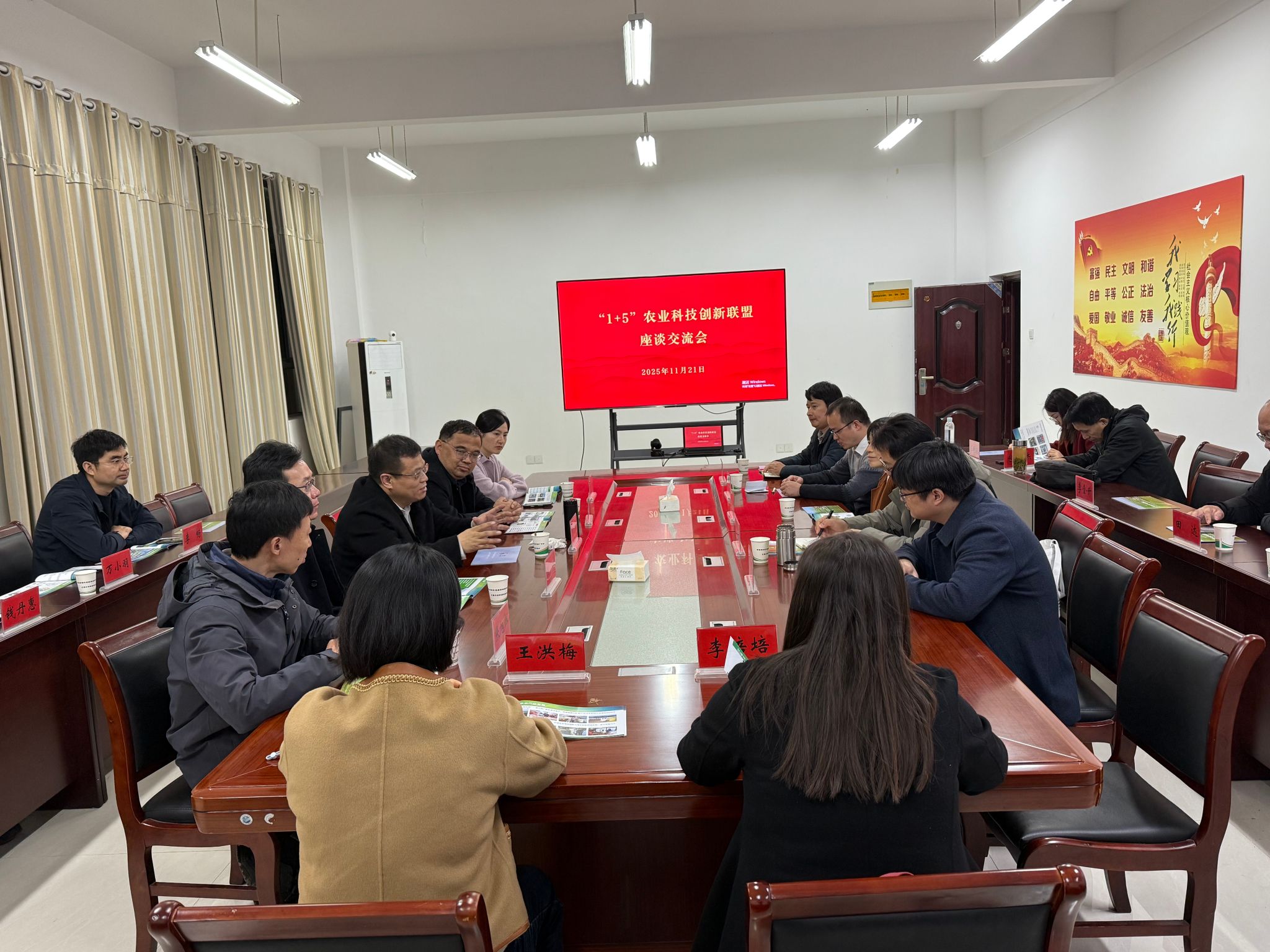 随后,大家就“1+5”农业科技创新联盟展开座谈。该联盟由“1”(安徽省农业农村厅主导、安徽农业大学承接,包含省农科院、安徽科技学院等省内机构)和“5”(中国农科院、中国农业大学、西北农林科技大学、南京农业大学、华中农业大学)共同组成。座谈会上,我院张瑞福院长、安徽农大张震院长和河南农大王宜伦院长分别代表三省三校农资环领域达成合作共识,整合联盟成员单位资源,构建党建科教协同创新平台,聚焦粮食安全、智能农机等重点领域开展技术攻关,推动农业科技创新和产业创新深度融合,推动农业教育科技人才一体发展,推动农业科技开放合作,更好地服务农业强国建设。