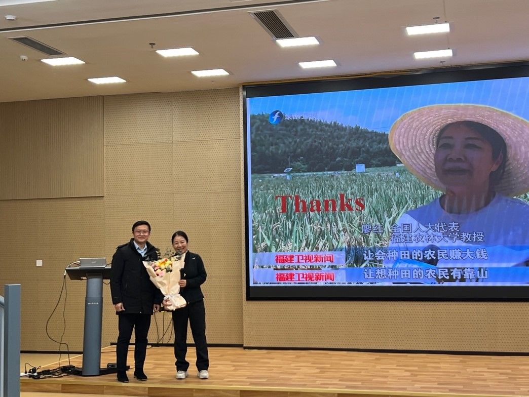 报告后,沈其荣作总结发言。他高度肯定廖红教授“扎根田间、研用结合”的科研理念与实践成果,并指出廖红教授科研工作最大亮点是将枯燥的书本知识转化为鲜活的实践探索,真正实现了科研与实践的深度融合、理论与应用的同频共振,为农业科技工作者树立了榜样。植物营养与肥料学系教工党支部党员顾冕教授作为教师代表上台献花,向廖红教授致以诚挚感谢。本次报告兼具思想深度与实践价值,为现场师生带来深刻启发与奋进力量。