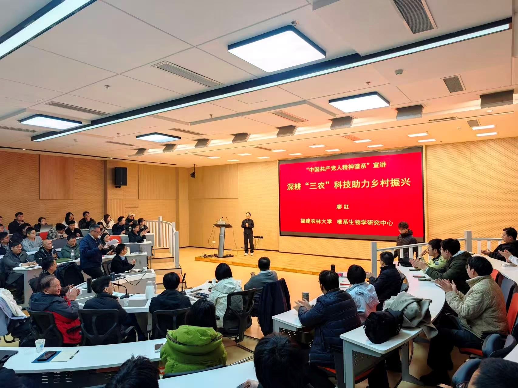 2026年1月11日,我校教育部“强国行”专项行动团队植物营养与肥料学系教工党支部,与作物遗传与种质创新利用全国重点实验室直属党支部开展支部共建活动。活动特邀“中国共产党人精神谱系”宣讲团成员、福建农林大学资源与环境学院根系生物学研究中心主任廖红教授来校,作“中国共产党人精神谱系”专题宣讲。中国工程院院士沈其荣与两个支部全体成员一同在现场聆听了报告。