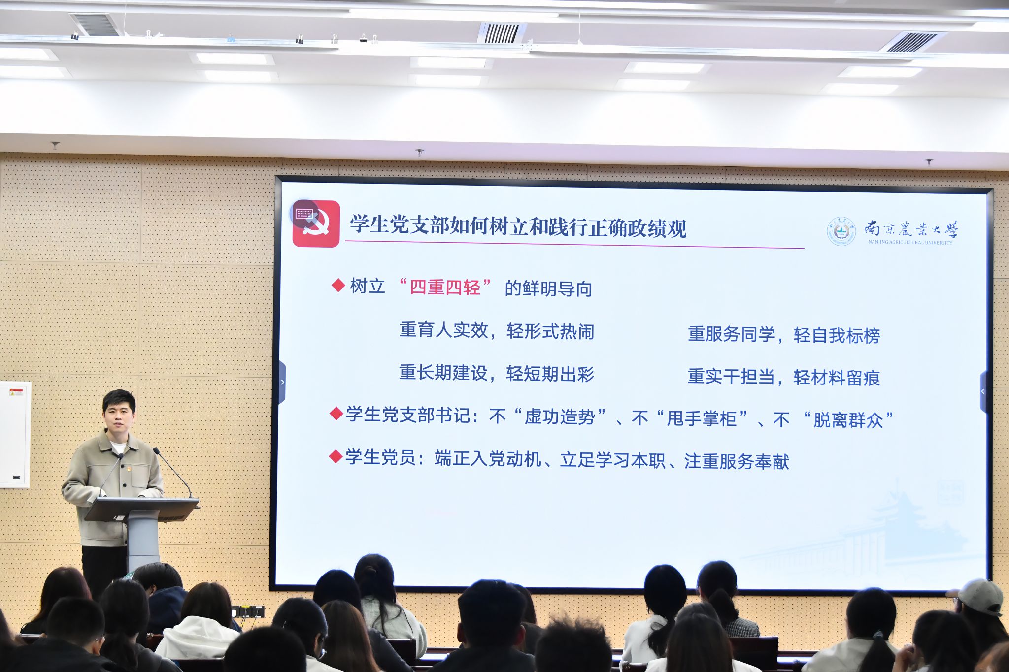最后,学院党委书记李荣讲授《实干践初心 实绩显担当——以正确政绩观引领资环学院高质量发展》专题党课。他结合学院发展实际,从正确政绩观的核心内涵、党性修养与岗位履职的内在关联、政绩观偏差的典型表现等方面深入阐释,引导全体党支部书记和新党员们坚守全心全意为人民服务宗旨,坚持实事求是、真抓实干,以经得起实践、人民和历史检验的实绩推动学院高质量发展。