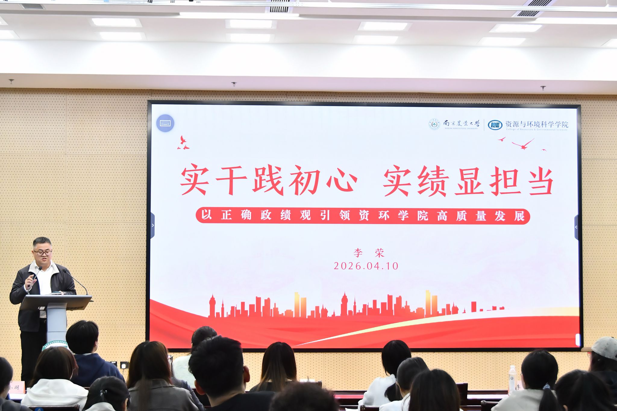2026年4月10日,资环学院树立和践行正确政绩观学习教育党支部专题培训会在滨江19号楼报告厅举行。院党委书记李荣、副书记孙笑逸、校党校办主任何旭、全体党支部书记及2025年度新发展党员参加会议。会议由院组织员万小羽主持。