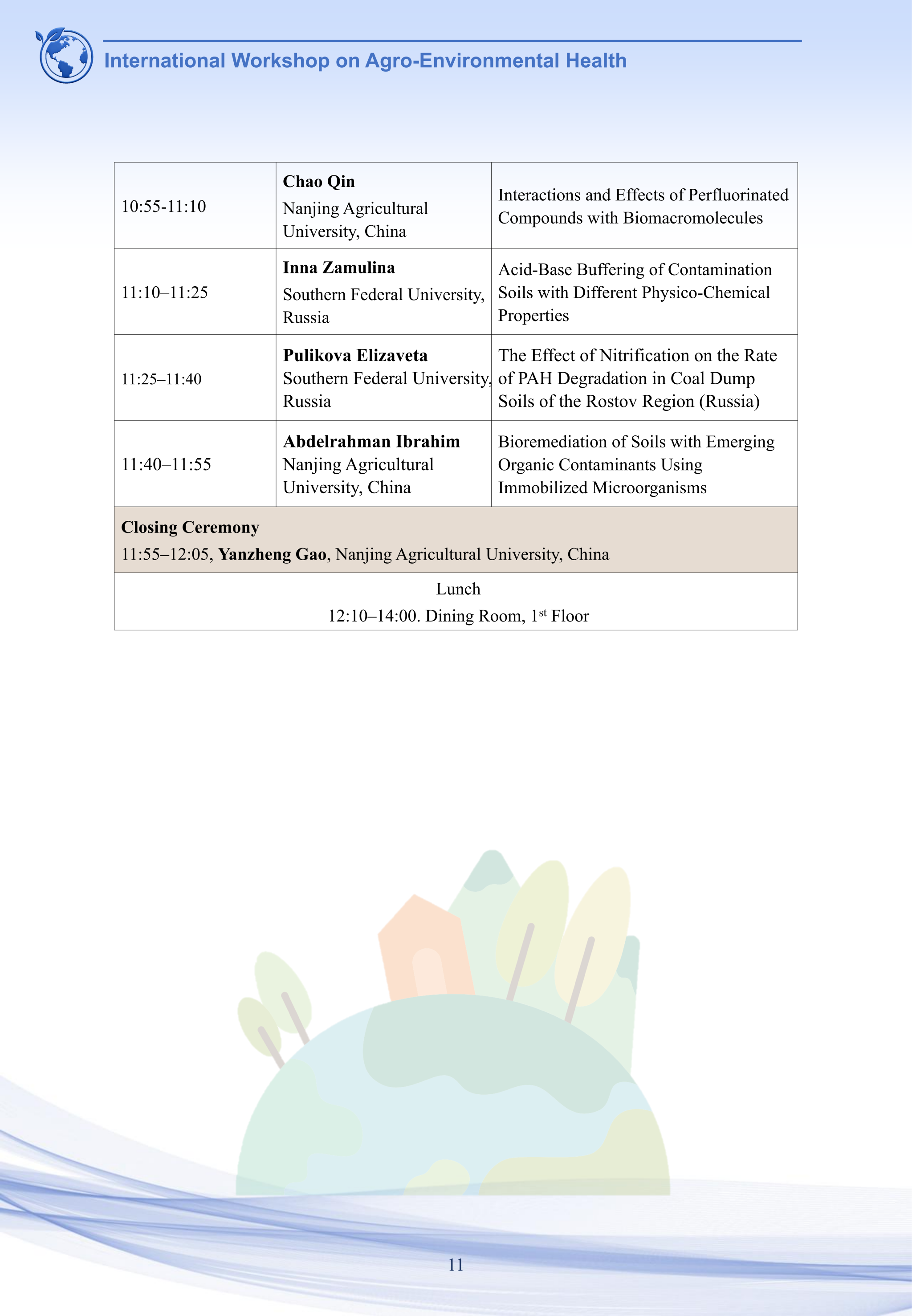 2025农业环境健康国际学术研讨会将于2025年10月11-14日在江苏省南京市南京农业大学学术交流中心(翰苑宾馆)召开,欢迎感兴趣的老师和学生参会交流。会议议程如下: