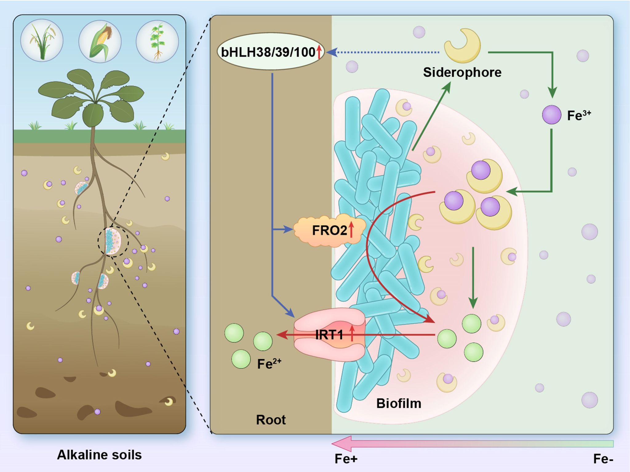 深入研究发现,该菌株在根表原位定殖形成生物膜时可以富集铁,作为铁库,促进植物铁吸收。此外,还发现铁载体Bacillibactin在这个过程中发挥着双重作用:生物膜铁富集和激活植物缺铁响应(图2)。本研究强调了根际芽孢杆菌生物膜和铁载体在其促进植物铁吸收过程中的关键作用,为微生物介导的植物铁吸收机制提供了新见解,也为作物铁营养的微生物强化策略提供了新的理论基础。