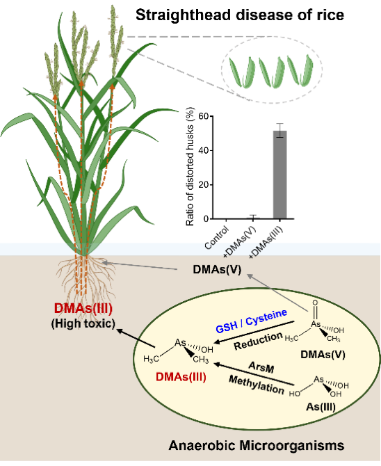 图1. 稻田土壤中DMAs(III)的产生途径和机制,及其更易诱发水稻“直穗病”