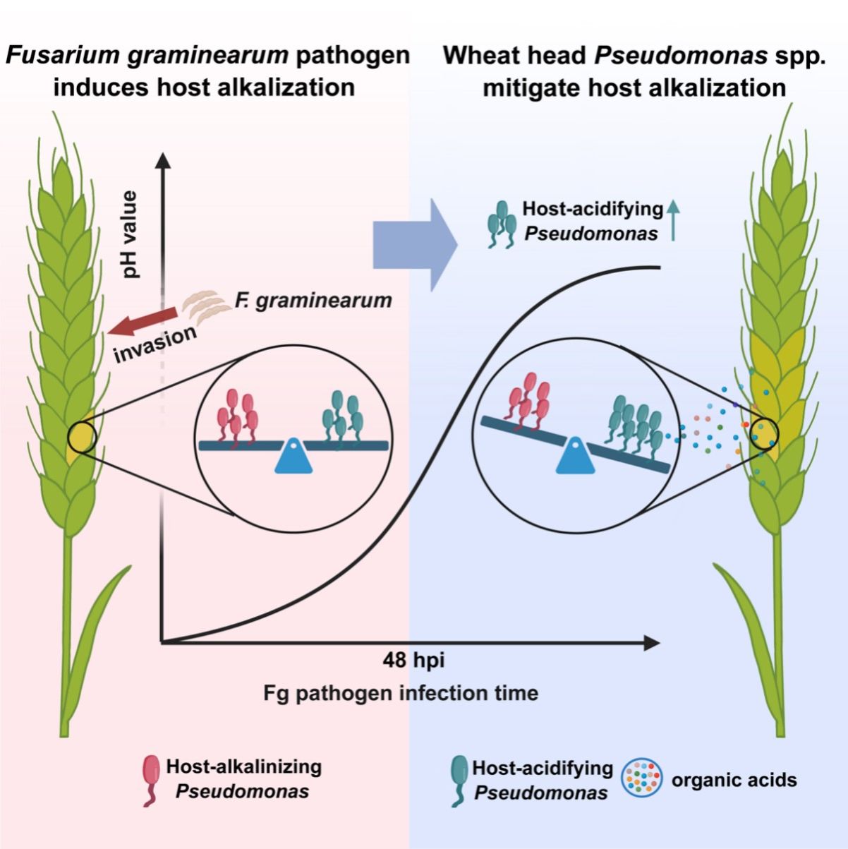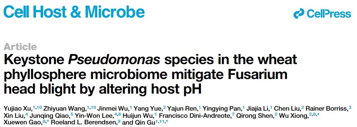近日,南京农业大学沈其荣院士团队熊武教授与植保学院高学文/顾沁教授团队合作,在微生物学领域国际权威期刊《Cell Host & Microbe》发表题为“Keystone Pseudomonas species in the wheat phyllosphere microbiome mitigate Fusarium head blight by altering host pH”的研究论文。小麦赤霉病是威胁全球农业生物安全的重大真菌病害。赤霉病菌侵染小麦时,会通过诱导寄主碱化来增强自身致病力。与此同时,小麦穗部的天然微生物群落中潜藏着一类能够“以酸制碱”的守护者——寄主酸化型假单胞菌。这些细菌在赤霉病菌侵入时被招募至麦穗,分泌有机酸降低病原菌诱导的寄主碱化效应,从而有效抑制赤霉病的发生。该研究揭示了寄主、病原菌与有益微生物间围绕pH的精妙博弈,并展示了通过调控寄主微环境实现作物绿色防控的新思路。