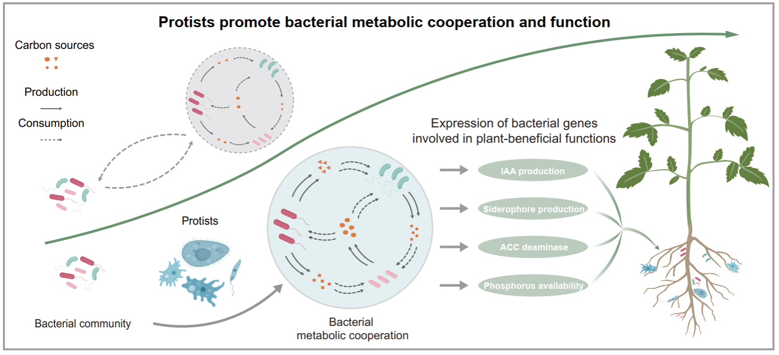 综上所述,本研究表明原生动物不仅是“细菌消费者”,更可能是调控细菌群落代谢方式与生态功能的关键“工程师”。研究提出的定量分析框架为评估原生动物驱动的细菌合作及其生态功能提供了可复制的研究路径,并为未来从跨界(cross-kingdom)视角解析根际微生物组与植物健康的调控机制提供了坚实的理论与方法学基础。