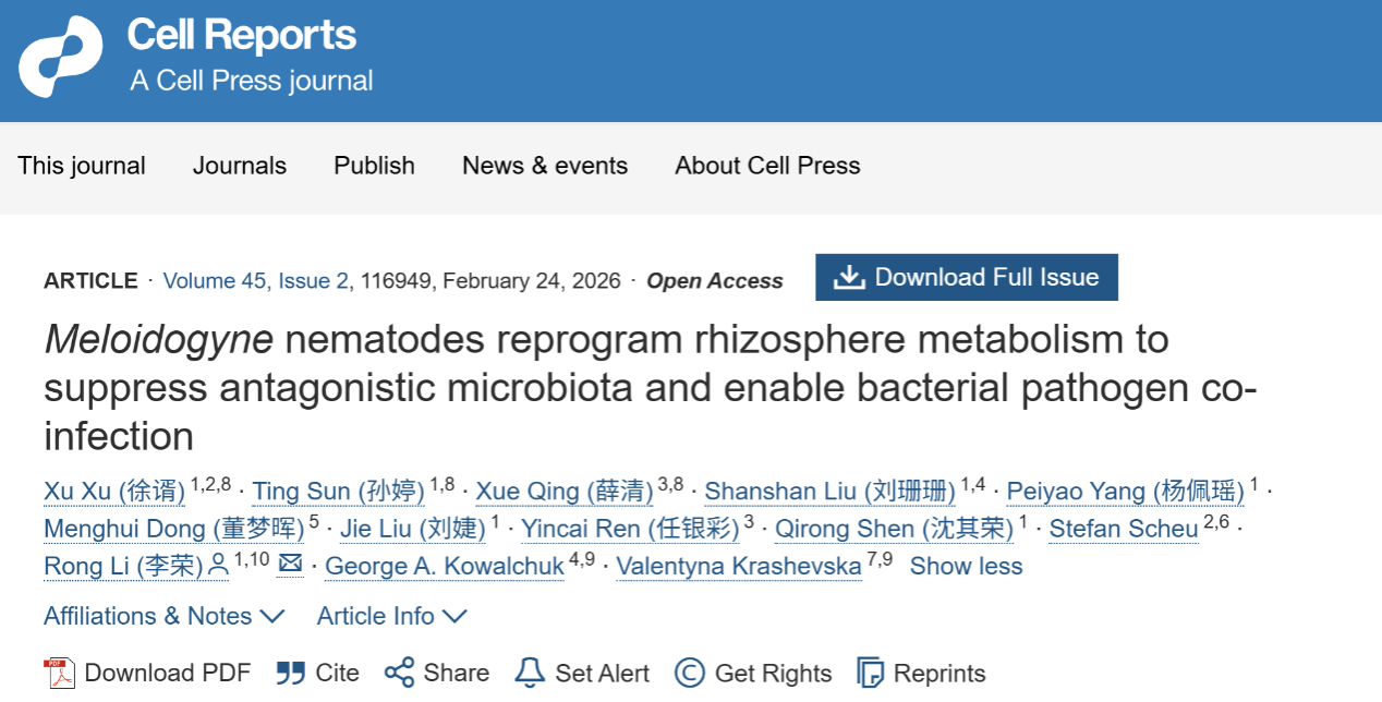 近日,南京农业大学沈其荣院士团队李荣课题组在土壤病原线虫重编程根际代谢抑制拮抗微生物群落并促进细菌病菌入侵机制研究方面取得重要进展,成果以《Meloidogyne nematodes reprogram rhizosphere metabolism to suppress antagonistic microbiota and enable bacterial pathogen co-infection》为题发表于国际学术期刊《Cell Reports》。该研究系统解析了根结线虫对植物代谢过程及根际微生物群落结构的调控机制,揭示了线虫通过重塑植物—微生物互作关系,促进病原生物协同侵染植物的新模式。